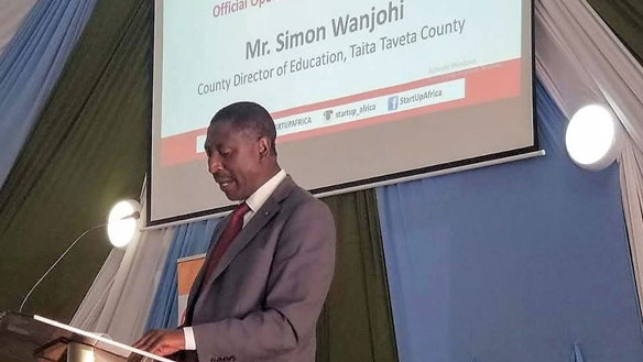 • Mr. Mwangi Wanjohi, Taita Taveta County Director of Education, reading a speech on behalf of the Cabinet Secretary of Education, Amb Mohammed Amina. He officially opened the Pitch Africa National Youth Pitch Competition